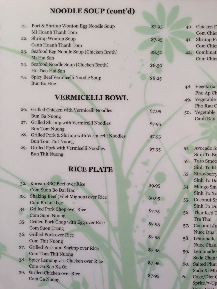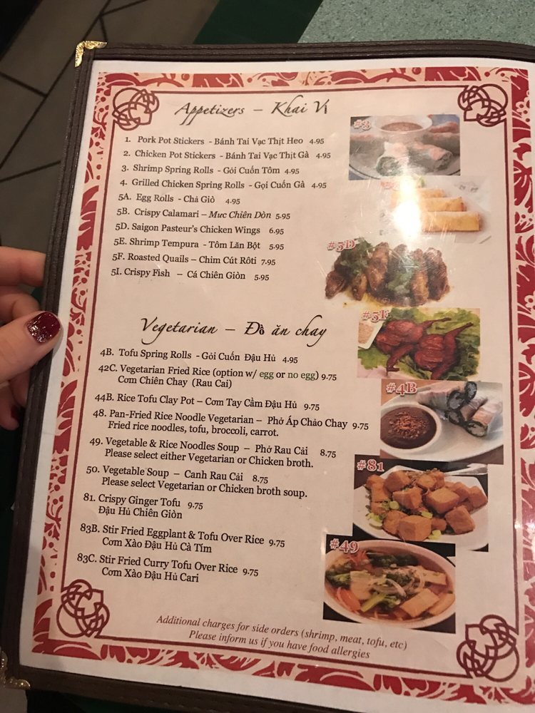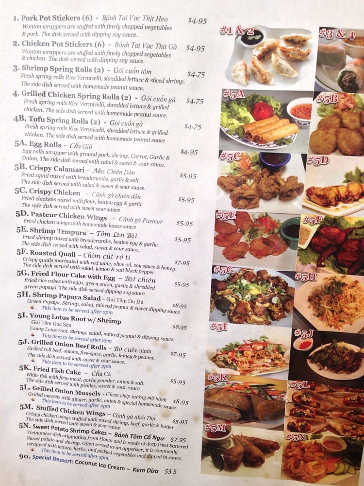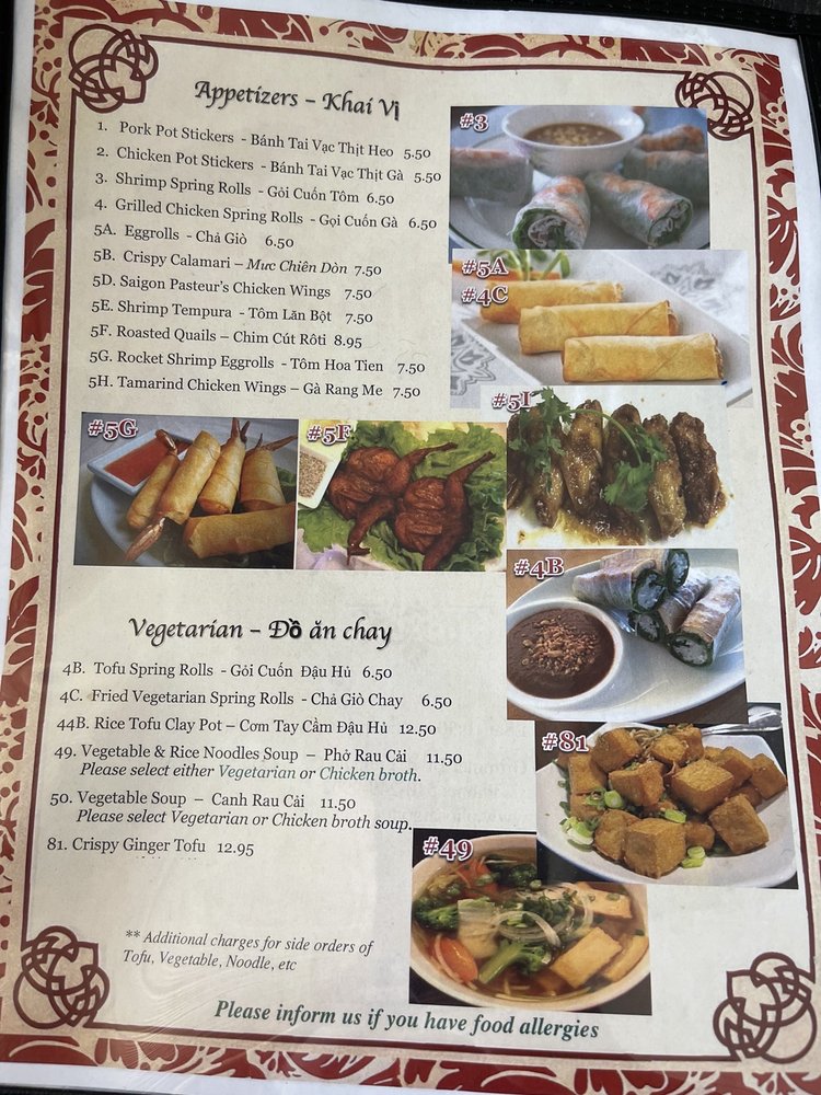 The menu at Pho Saigon Pasteur features tantalizing appetizers like Pork Pot Stickers and Shrimp Spring Rolls, along with vegetarian delights like Tofu Spring Rolls and Vegetable Soup. Don't miss out on their signature Pho and Noodle Soup dishes, including the Combination Beef Noodle Soup and Rare Beef Noodle Soup.